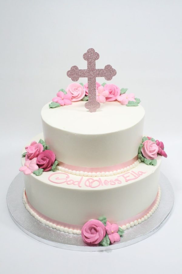 This design features a delicate metallic cross on top with coordinating ribbon borders and buttercream flowers. Pricing includes your choice of ribbon and pastel flowers to match. Shown as a 8” + 12” frosted in vanilla buttercream with a metallic cross and shades of pink flowers. Available in all flavors and sizes with 1 week notice.Item#: 7510 (tiering + standard sizes + topper)