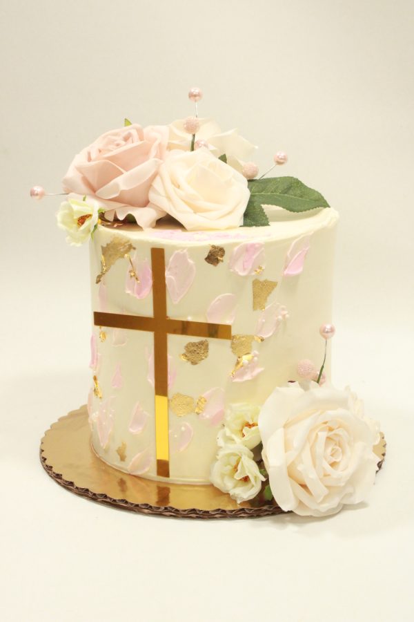 This cake, as shown, is an exaggerated tall, 4 Layer cake. Featuring Vanilla buttercream frosting with a “rough crown” finish. Pricing includes customer’s choice 1 color spackle finish with edible silver leaf, a 6″ mirrored cross on the front side and coordinating color silk flower clusters