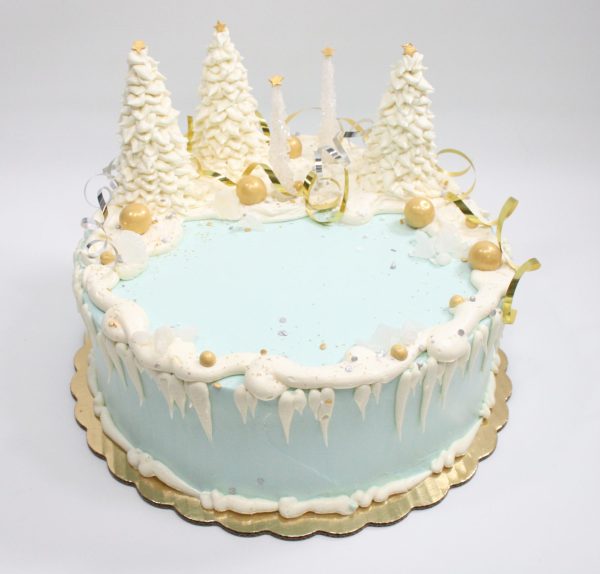Dress up any winter or holiday party with this wintery scene. Frosted in a pale icy blue buttercream with snowy ice cream cone trees and gold edible accents. Shown as a 10″ cake. Smallest available size is an 8” Round.