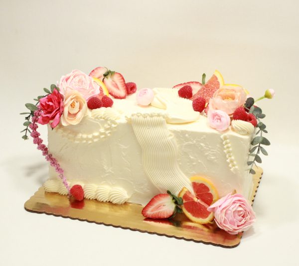 Our Garden Party design is four layers in height and rectangular, decorated with customers choice of silk flower colors, abstract piping, and chef’s choice seasonal fruit accents. Shown as a 1/4 sheet with shades of pink silk flowers, eucalyptus, red berries, winter citrus.This cake is available in 4L 1/4 sheet, 4L 1/2 sheet, or 4L Full sheet with vanilla Italian buttercream only due to the intricate design work. This gorgeous cake is perfect for birthdays, baby showers, & bridal showers and can be tailored to any season! Kindly let us know of any fruit allergies in the box below and note any general allergies in the notes box at checkout. This design is available with 1 week’s notice, call to inquire about sooner availability.