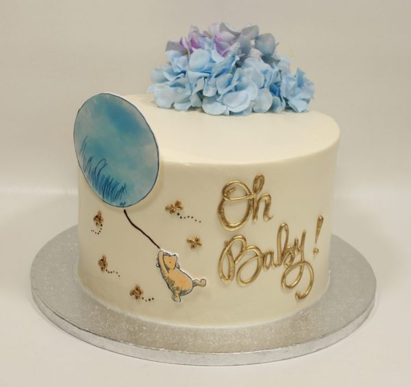 This adorable cake, frosted in vanilla buttercream, showcases an edible image of Winnie the Pooh & a balloon on rolled chocolate. Accented with a cluster of silk flowers, gold detailing, and a gold inscription. Pricing includes customer’s choice of silk flower colors & gold inscription. Note: if you order this cake as a 12” or larger, the balloon & Pooh will be moved to the top of the cake!