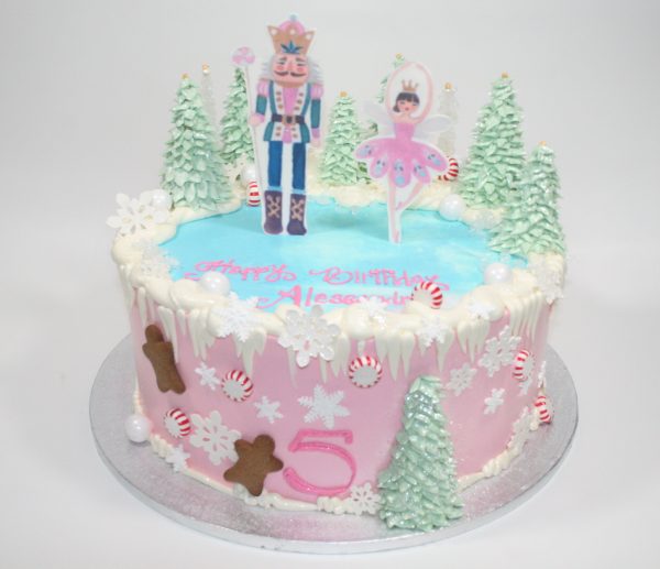 This cake includes a festive scene with pink & blue buttercream, winter trees, snowflake detailing, & and a propped edible image of a nutcracker & ballerina on rolled chocolate. Price includes customer choice of inscription, design as shown.