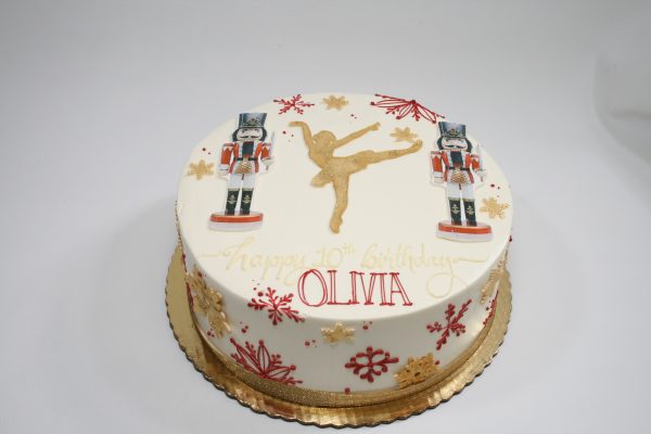 This cake includes centerpiece gold ballerina with edible image nutcrackers, gold rolled chocolate detailing & red snowflake detailing. Customer choice of one color detailing.