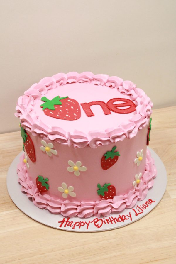 This cake is frosted in light pink buttercream with buttercream borders and rolled chocolate applique strawberries and white flowers. Topped with a large rolled chocolate strawberry and lettering. Inscription available as ‘One’ or ‘Two’ with the strawberry as the letter ‘O’. Please specify below if you would like One or Two on the top of the cake. Full availability with 7 day’s notice. Shown as a 4L 8”. Available as standard 3 layer or 4 layer. Note 4 layer cakes are taller in height, some customers find them harder to serve.