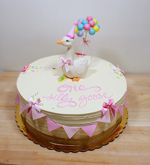 This adorable cake is perfect for a first birthday or Silly Goose on the Loose party! Frosted in vanilla buttercream with horizontal drag, adorned with a hand-made goose made of rolled chocolate with a festive party hat, balloons, and bow. The cake is finished with rolled chocolate flag buntings, bows, and pastel sprinkles. This design includes your choice of color and inscription! Shown as a 12” round in shades of pink.