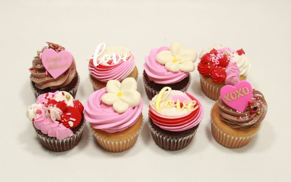 8 pack of Vanilla & Chocolate cupcakes with assorted Vanilla and Chocolate Buttercream frosting, garnished with joyful valentines sprinkles, plastic ring hearts & love toppers.Available to order online with 2 days notice. Call our store for availability if needed sooner.