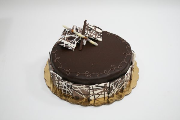 Rich chocolate cake layered with chocolate mousse. Finished with chocolate ganache and chocolate adornments.