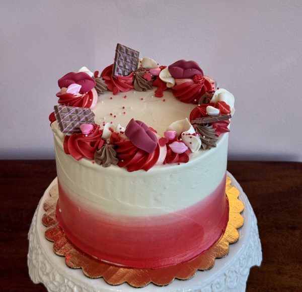 This design is how you’ll find our red velvet cake in our store during Valentine’s day; A traditional southern favorite, this cake is scarlet in color, accented with just enough chocolate to make it irresistible. Filled with a cream cheese filling. Shown as a 6″ and 8″ cake with vanilla buttercream with pink chocolate love themed adornments, and sprinkles.