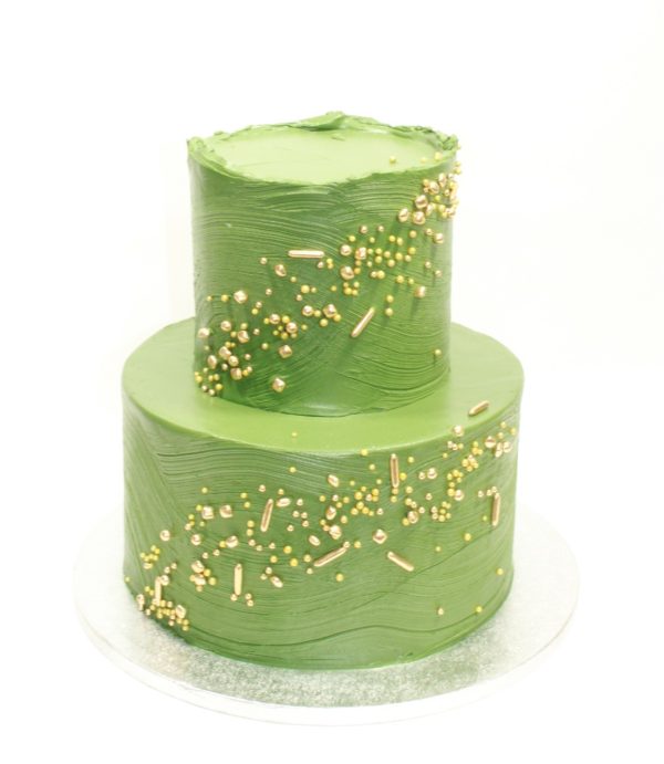 This two tier cake features your choice of color accented with gold dragees. This customizable design can be catered to any event with a wide range of color options. Shown as a 4L 6” & 4L 10” in olive green. Available as standard 3 layer or 4 layer. Note 4 layer cakes are taller in height, some customers find them harder to serve.