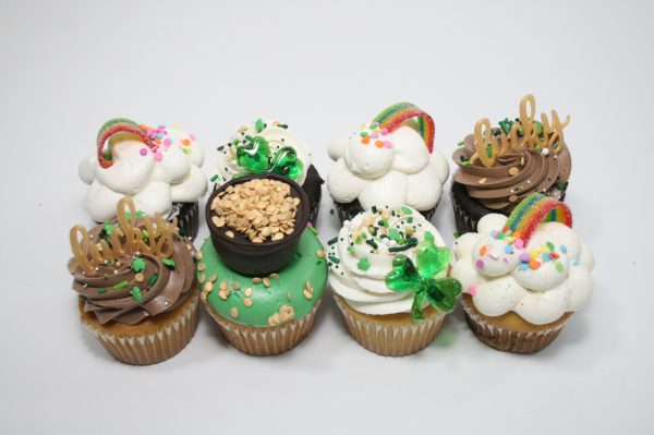 8 pack of Vanilla & Chocolate cupcakes with an assortment of St. Patrick’s themed decorations.