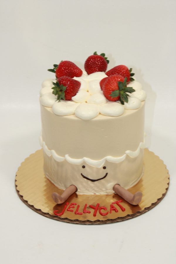 This cake is frosted in light pink buttercream with buttercream borders and rolled chocolate applique strawberries and white flowers. Topped with a large rolled chocolate strawberry and lettering. Inscription available as ‘One’ or ‘Two’ with the strawberry as the letter ‘O’. Please specify below if you would like One or Two on the top of the cake. Full availability with 7 day’s notice. Shown as a 4L 8”. Available as standard 3 layer or 4 layer. Note 4 layer cakes are taller in height, some customers find them harder to serve.