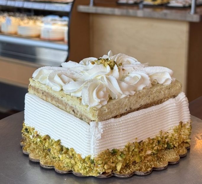 Fluffy pistachio chiffon cake, accented with coffee. Layered with pistachio mascarpone mousse, topped with fresh whipped cream.
