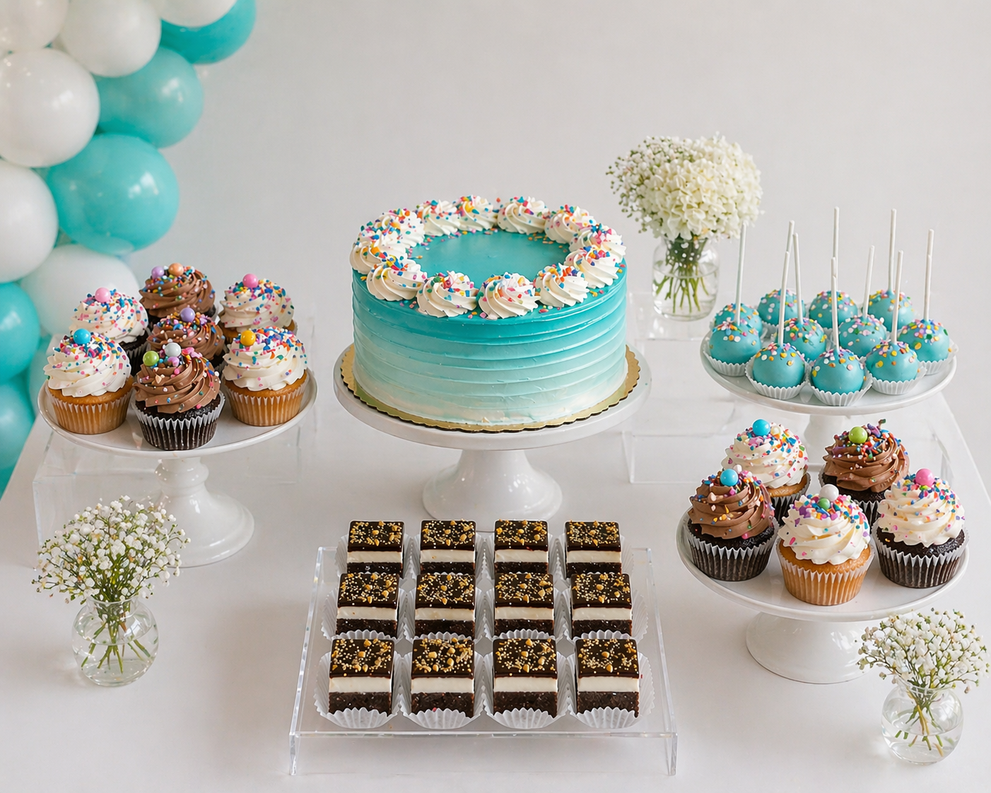 Celebrate your birthday with this fun Confetti Birthday Package! This set includes a centerpiece cake and your choice of ‘extras’ including select mini pastry and coordinating cake pops. Shown with confetti cake pops & frosted fudge brownies. Complement this package with our Birthday Cookies or Cupcakes! Abundance of products in package vary based on package size, see our Party Package Info page for our different package tiers & á la carte menu.