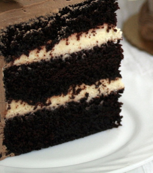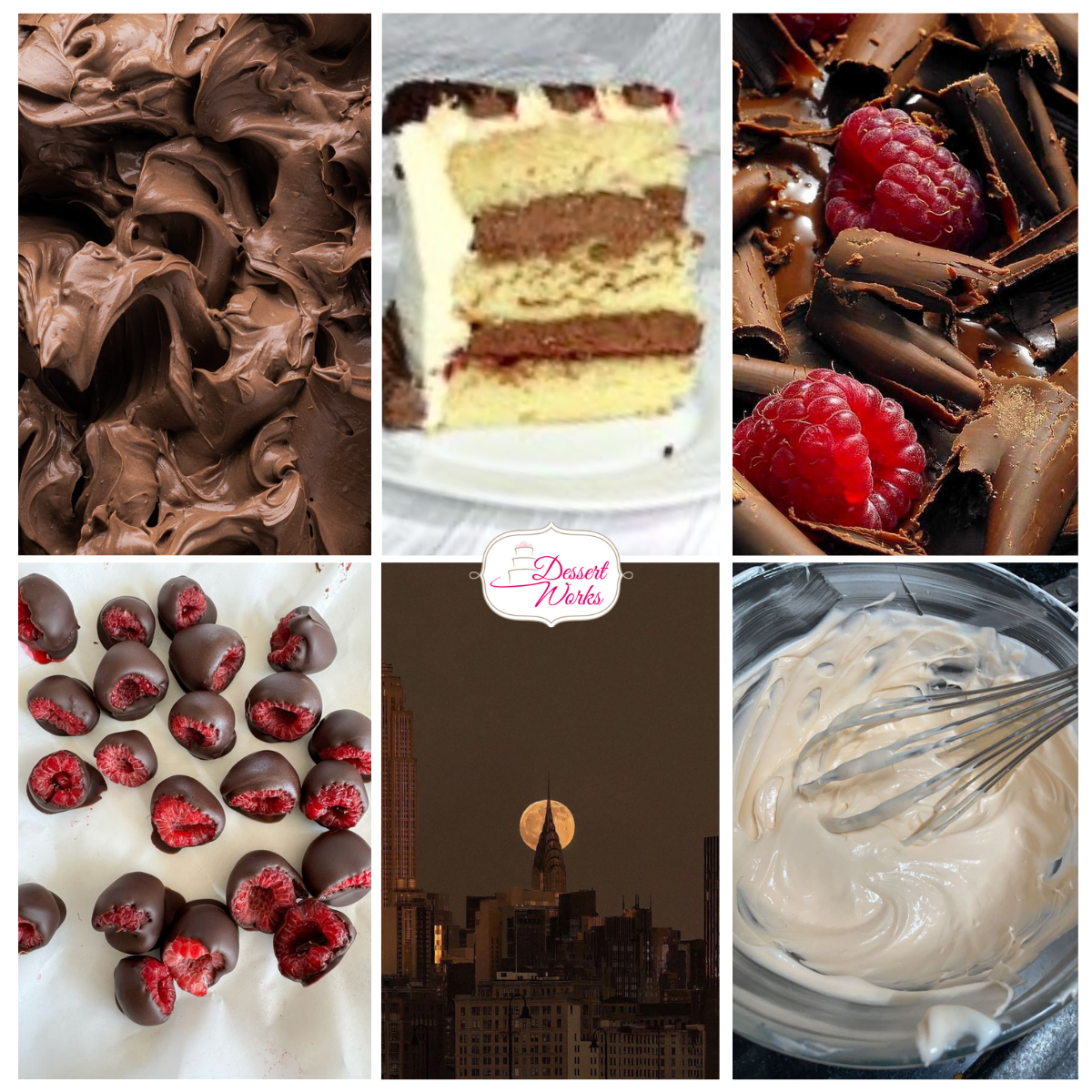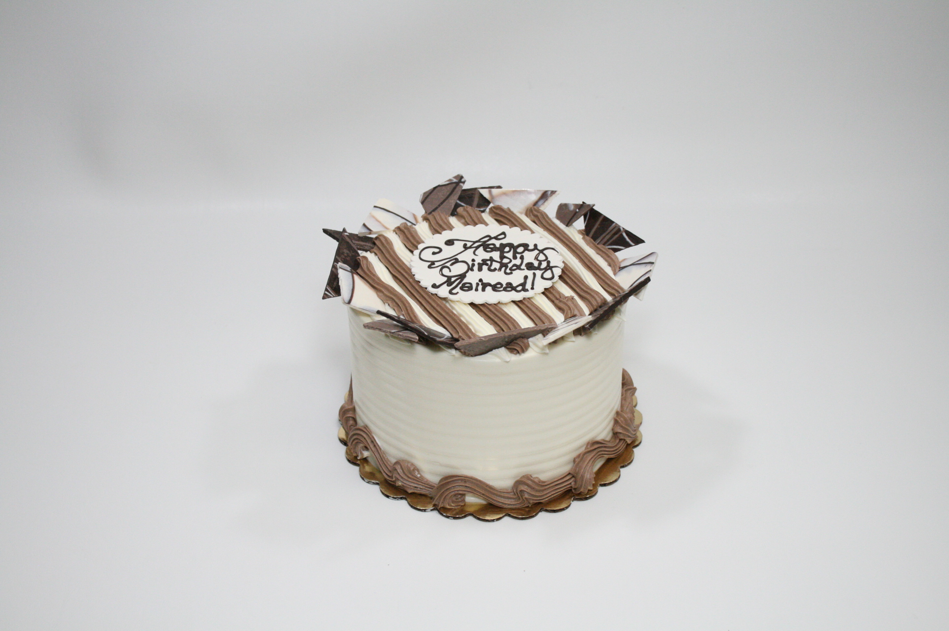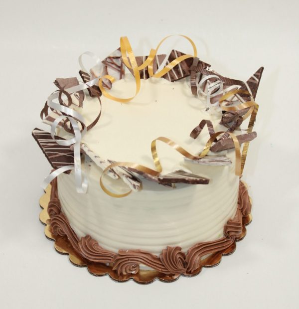 Vanilla chiffon cake layered with rich chocolate mousse and an accent layer of raspberry preserves. Shown as a 6″ cake with traditional decor: vanilla buttercream frosting with combed finish on the side, vanilla and chocolate striped design on top, and festive chocolate adornments and sprinkles around the top edge.