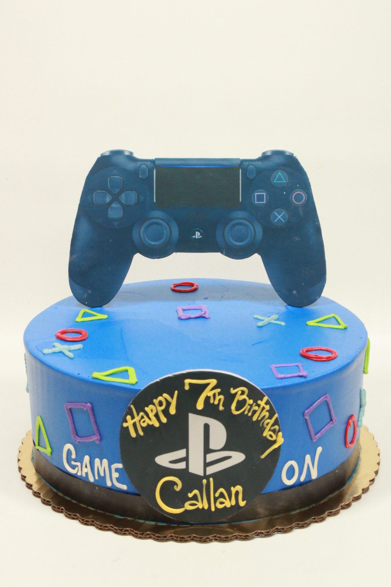This cake features an edible screen-printed PlayStation controller propped on top with the logo and controller shapes. This design includes customer’s choice color buttercream, all other details as shown: black ribbon border, buttercream game controller shapes, and images of PlayStation controller propped on top and logo on front. Shown as an 8” round in royal blue.