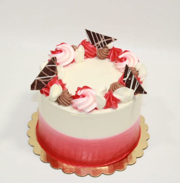 Rich chocolate cake layered with our dark chocolate mousse shown as a 6″ cake with Traditional decor chocolate buttercream frosting with combed finish on the side, chocolate buttercream borders, with festive chocolate adornments. This flavor is available in the store daily in 6″& 8″ round cakes.