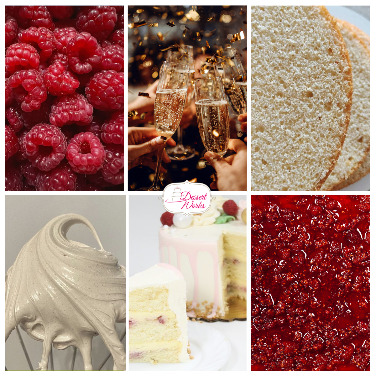 Vanilla chiffon cake layered with champagne mousse and a thin accent layer of raspberry preserves. Shown here as 6″ and 8″ cakes.