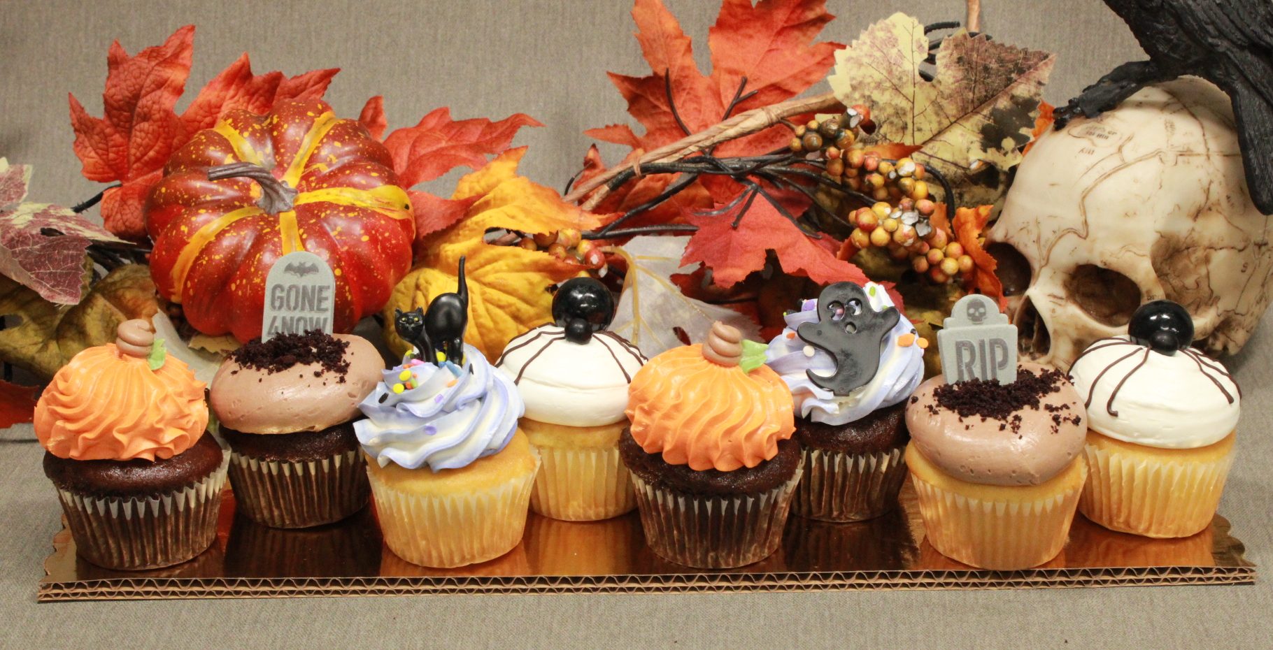 An 8 pack of cupcakes with assorted halloween decorations! 1/2 Vanilla, 1/2 chocolate no substitutions.