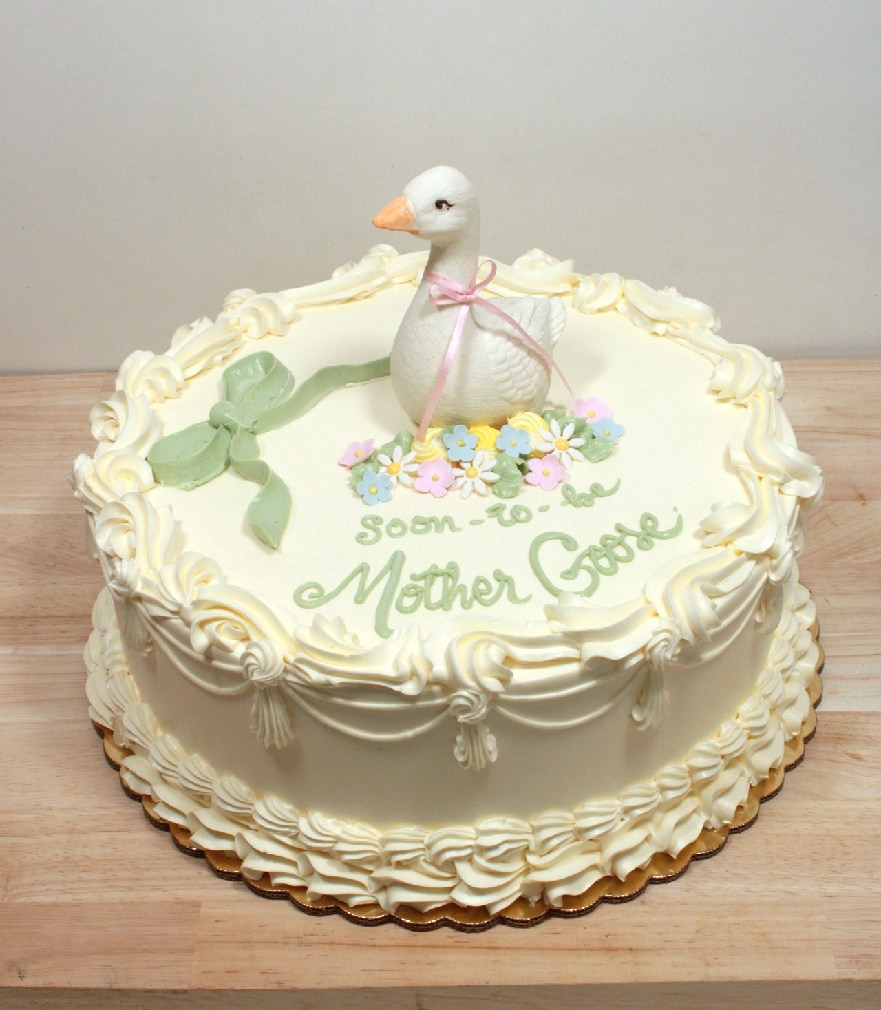 This adorable cake is perfect for a mom to be! Frosted in vanilla buttercream with vintage lambeth design work, adorned with a hand-made goose made of rolled chocolate with a sweet bow. The cake is finished with a buttercream bow and chef’s choice crescent of cupped rolled chocolate flowers. This design includes your choice of colored buttercream detailing and inscription! Shown as a 12” round in sage.