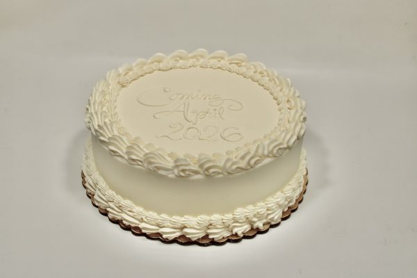 This design features the popular Lambeth technique on a round cake, minimum size 6″ cake. Design includes white frosting, pink buttercream hearts, and pink bows. Design comes as shown with customers choice of inscription. Shown as a 4L 8” cake. Available as standard 3L or exaggerated tall 4L. Please be aware: 4 layer cakes are taller than our standard 3 Layer cakes, for a dramatic presentation. Some people find them harder to serve