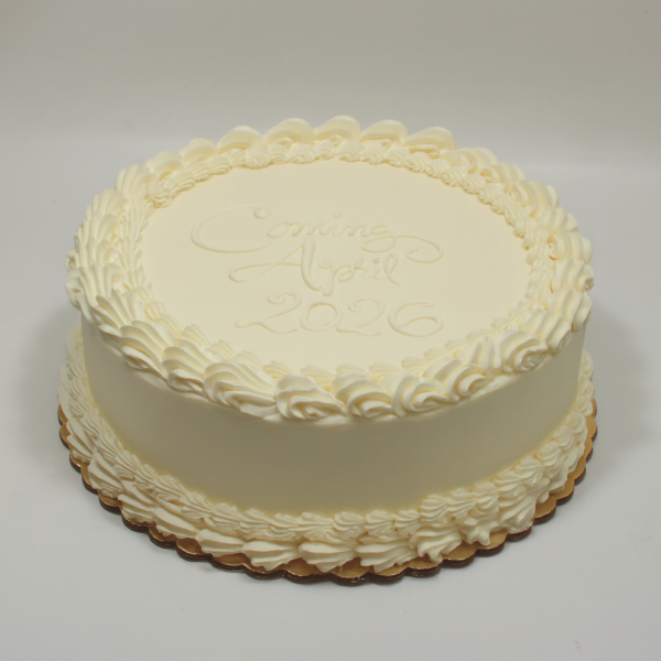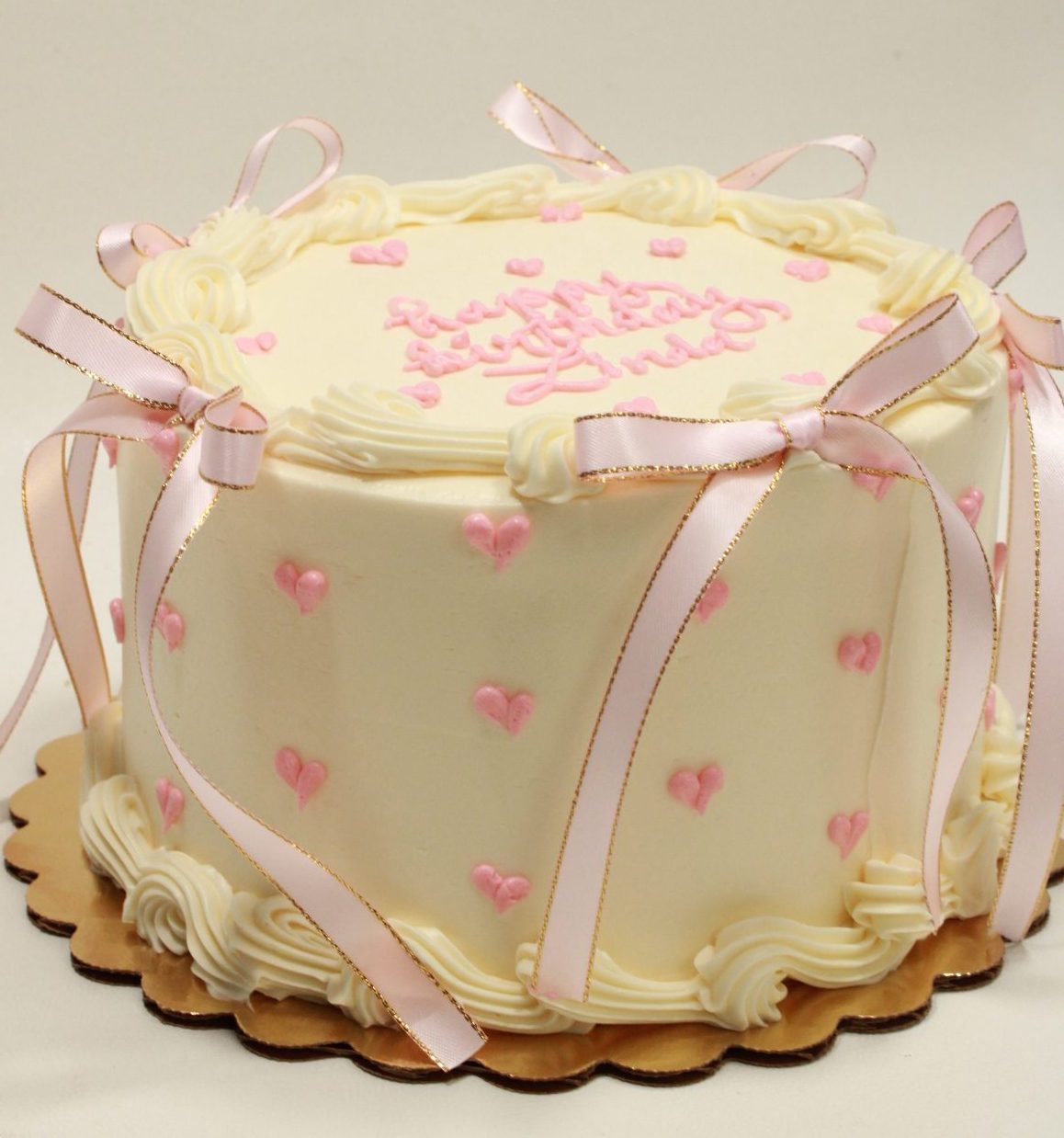 This design features the popular Lambeth technique on a round cake, minimum size 6″ cake. Design includes white frosting, pink buttercream hearts, and pink bows. Design comes as shown with customers choice of inscription. Shown as a 4L 8” cake. Available as standard 3L or exaggerated tall 4L. Please be aware: 4 layer cakes are taller than our standard 3 Layer cakes, for a dramatic presentation. Some people find them harder to serve