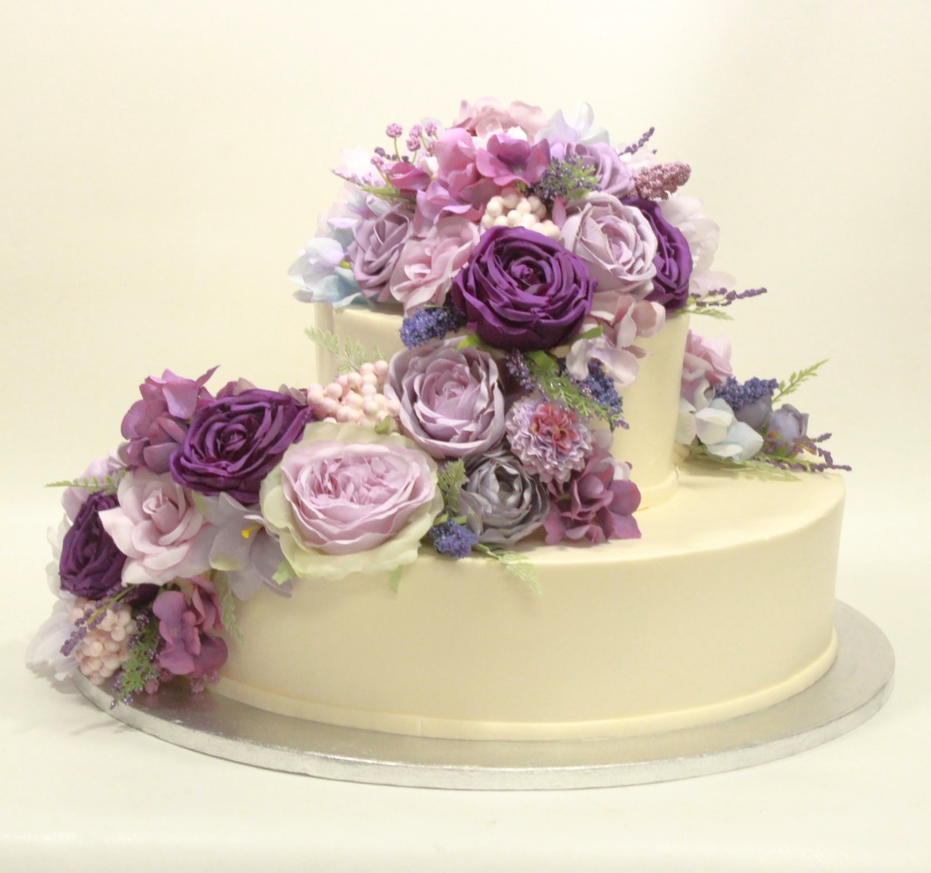 This 2 tier cake features smooth vanilla buttercream with your choice of silk flower color scheme in a cascade with a top bouquet. Shown as an 8” + 16” perfect for an elegant celebration!