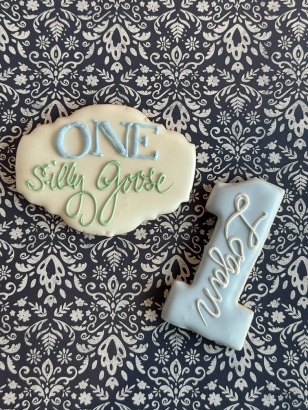 This adorable cake is perfect for a first birthday or Silly Goose on the Loose party! Frosted in vanilla buttercream with horizontal drag, adorned with a hand-made goose made of rolled chocolate with a festive party hat, balloons, and bow. The cake is finished with rolled chocolate flag buntings, bows, and pastel sprinkles. This design includes your choice of color and inscription! Shown as a 12” round in shades of pink.