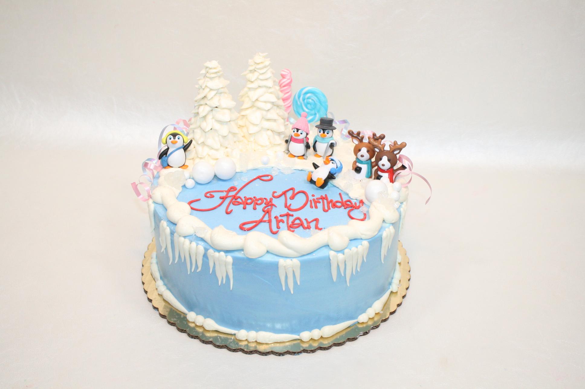 This cake features a fun winter scene with vanilla buttercream snow covered pine trees, plastic penguins & reindeer & lollipops. (NOTE: Design availability contingent upon figurine inventory.)