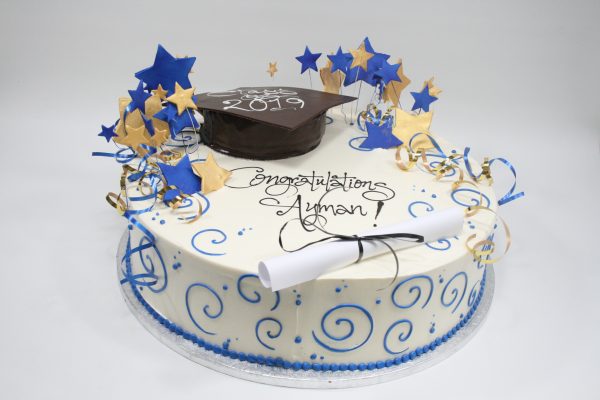 This graduation cake is frosted in buttercream and fun, festive decorations! Includes a plastic graduation cap on top, white hand-drawn buttercream swirls & dots, and your choice of one color shooting stars mixed with white. Shown as a 14″ with gold & blue shooting stars and matching curling ribbon. This cake is available as a 12” or larger due to the cap size.