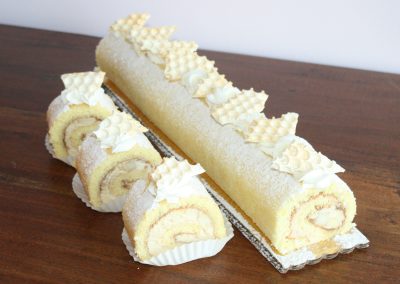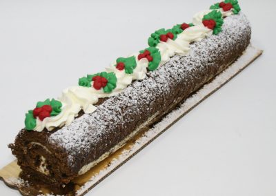 Tender spiced gingerbread cake accented lightly with apricot preserves, filled with sweet cream cheese, rolled and garnished with confectioner’s sugar, fresh whipped cream, buttercream holly berries & leaves.
