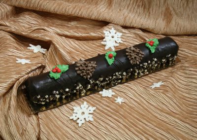 A traditional holliday favorite “Yule Log”. Chocolate cake & chocolate mousse rolled & glazed in dark chocolate ganache, decorated with sugar poinsettias & chocolate buttercream pinecones.