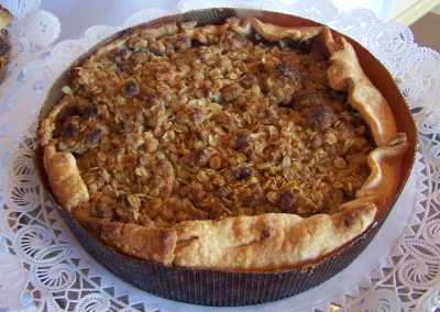 A deep-dish open-faced flaky tart, brimming generously with fresh locally grown, hand-peeled Cortland & Ginger gold apples seasoned, & topped with brown sugar oatmeal streusel.