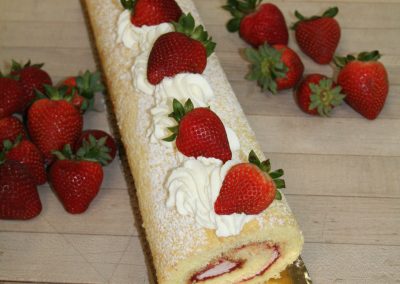 A fluffy vanilla sponge cake baked thin, filled with strawberry preserves, sweet strawberry mousse, rolled up tightly like a log and finished in a generous dusting of powdered sugar & topped with fresh whipped cream and berries