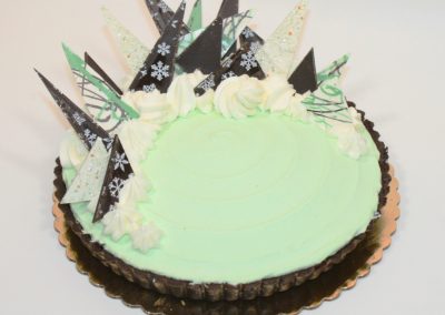 Traditional vanilla genoise “layer finger” cake brushed generously with espresso & rum, filled with sweetened mascarpone mousse. Decorated with dark chocolate shavings, cocoa powder, and white chocolate snowflakes.