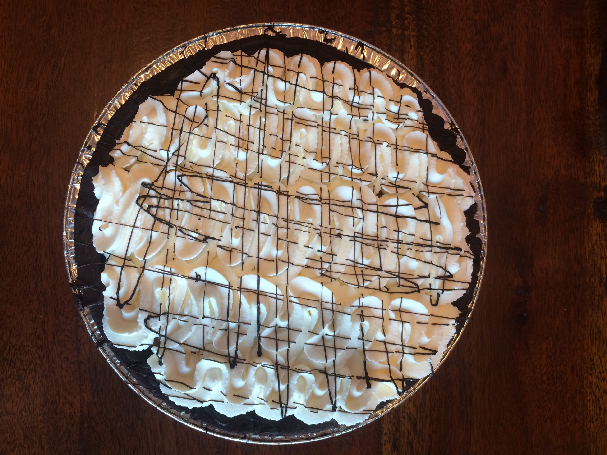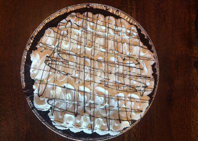 An open-faced chocolate crust filled with dark chocolate mousse & topped generously with fresh whipped cream.