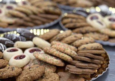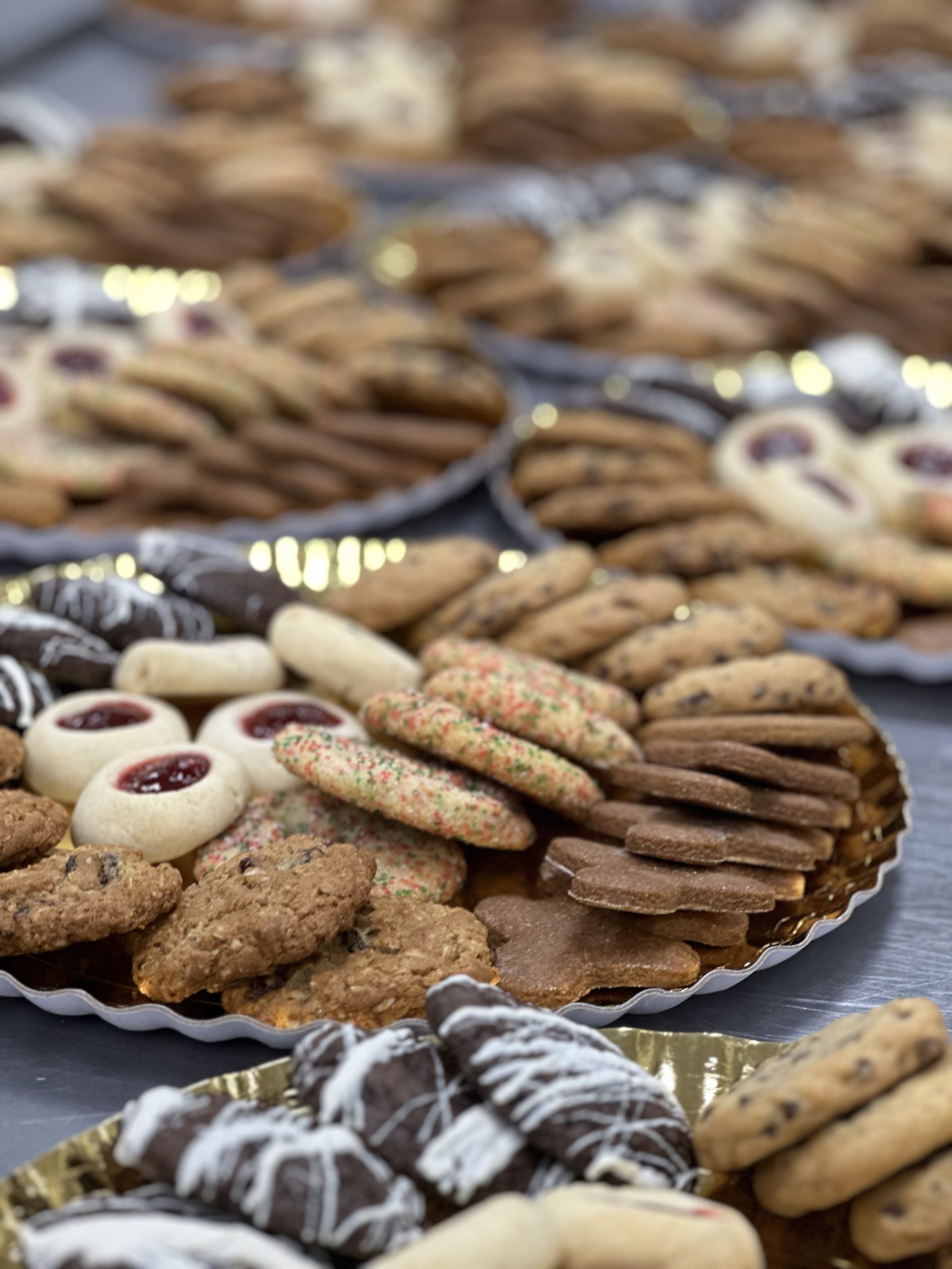 Beautiful assortment of buttery cookies on a tray wrapped in cellophane. Includes gingerbread men, chocolate chip, chocolate krinkle, raspberry thumbprints, red velvet, & apple cider cookies.