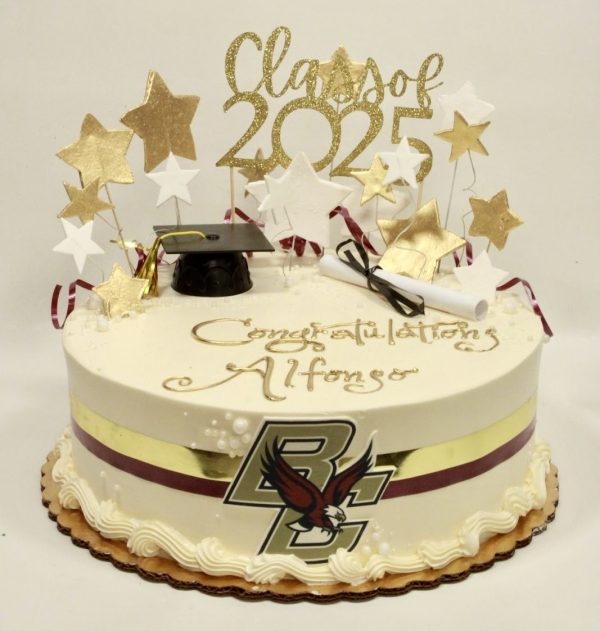 This cake is frosted in vanilla buttercream featuring an edible image of your school’s logo, a plastic graduation cap & paper diploma, ‘class of’ topper, and shooting stars in your choice of one color plus white. Shown here as an 12” cake. Cap is 3″ only so looks best on 12″ cakes or smaller.