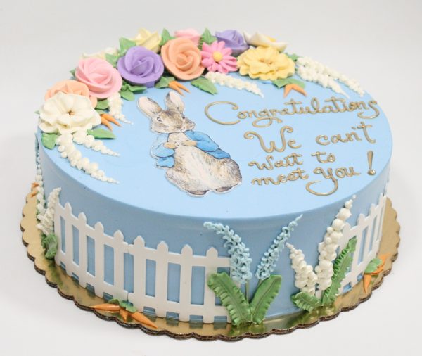 This adorable design features pastel blue buttercream with an edible image of Peter Rabbit. Accented with a rolled chocolate fence and a crescent of buttercream flowers, perfect for a baby shower or birthday!
