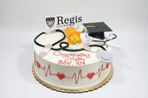 This design includes you school logo, rolled chocolate detailing including a stethoscope and bandaids, pill bottle, candy pills, grad cap & diploma with EKG detailing on the side. Design as shown, with your school logo. We will print an edible image of the school logos—email your own high quality image to us at retail@dessertworks.net when you place your order, or fill out the school names below and we will find one that works well!
