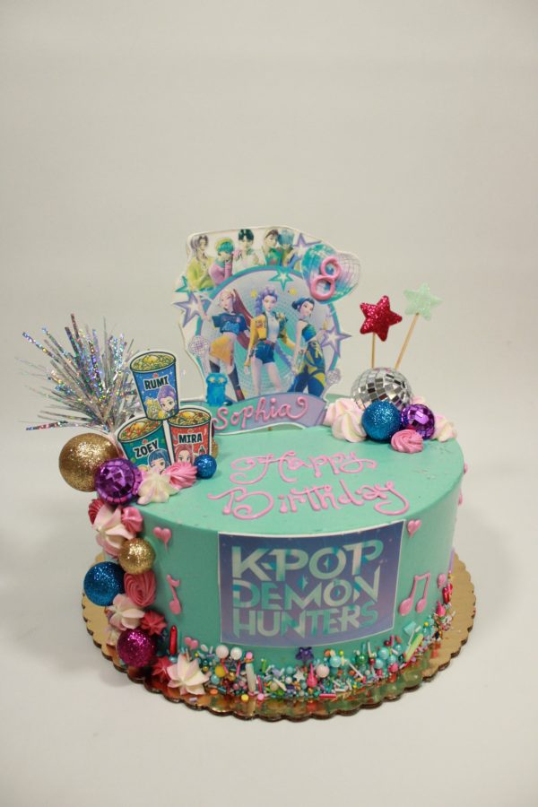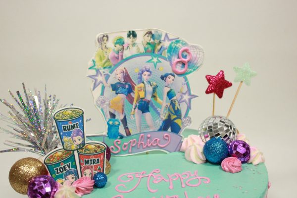 This design features images from the popular K-POP Demon Hunters movie. This cake includes a tiffany blue colored buttercream, propped rolled chocolate sign & logo, and accented with glitter balls, disco balls, stars, buttercream rosettes and music notes, & sprinkles. Please indicate name & age to be included on propped image as well as desired inscription. Available in 8” or larger.