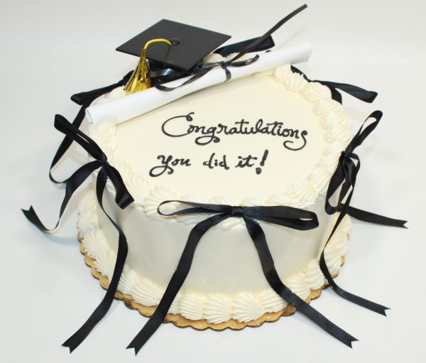 This design feature the popular Lambeth technique on a round cake, minimum size 6″ cake. Design includes white frosting & detail work, black long bows & paper diploma. This design is only available as shown.