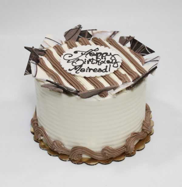 Vanilla chiffon cake layered with rich chocolate mousse and an accent layer of raspberry preserves. Shown as a 6″ cake with traditional decor: vanilla buttercream frosting with combed finish on the side, vanilla and chocolate striped design on top, and festive chocolate adornments and sprinkles around the top edge.Order this cake decorated as shown , or select from our other online galleries to order this flavor with any design you choose.